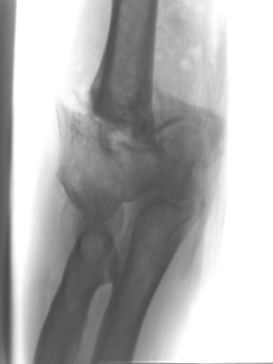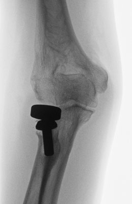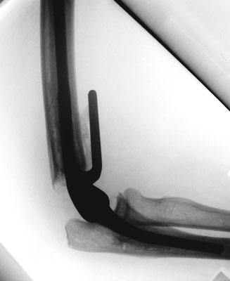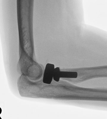 Ist allerdings die Gelenkfläche so stark zerstört, dass eine Rekonstruktion nicht möglich ist, bietet sich bei Patienten in höherem Lebensalter die Implantation einer Ellenbogenprothese an. Mit dieser ist eine gute Funktion zu erreichen.