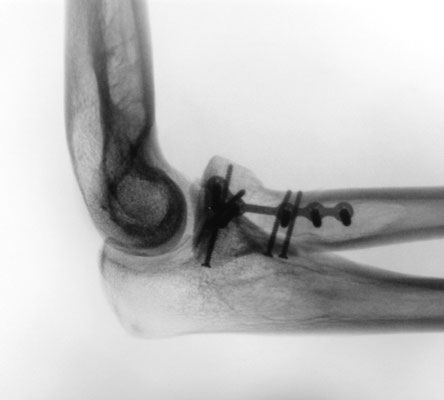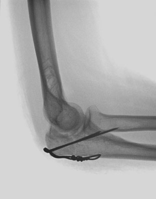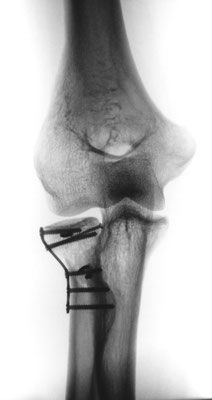 Der Ellenhaken (Olecranon) stellt den knöchernen Teil dar, über den die Kraft des Trizepsmuskels in den Unterarm geleitet wird und somit die aktive Streckung des Ellenbogens gegen Widerstand ermöglicht wird. Durch den Zug der Trizepssehne wird das kleine Knochenfragment weggezogen. Die Kraftübertragung des Muskels auf den Unterarm ist abgehängt. Insofern ergibt sich die Erfordernis, das Knochenteil und damit auch die Sehne des Trizeps wieder am Unterarm zu befestigen. Zusätzlich muss auch die Kongruenz des Gelenkes wieder hergestellt werden. Je nach dem, ob es sich um einen einfachen oder komplizierten Knochenbruch handelt, wird eine sog. Zuggurtungsosteosynthese mit zwei Drähten und einer Achterschlinge (Abb. 6a-b) oder eine Stabilisierung mit einer Platte durchgeführt.