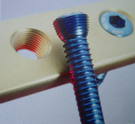 Ein Gewinde im Schraubenkopf fasst in ein Gewinde im Plattenloch (Abb.1). Die Konstruktion aus Platte und Schrauben ist auch ohne die Fixation am Knochen eine stabile Einheit und ist dann in der Lage, die gesamte axiale Last zu übernehmen und vom oberen auf das untere Knochenteil zu leiten (Abb.1 und 2). Eine zusätzliche knöcherne Abstützung, also eine anatomische Einrichtung, ist nicht erforderlich. So können Trümmerzonen (Abb.2) ohne Knochentransplantat stabil überbrückt werden. Das System ist nicht vom Anpressdruck der Platte gegen den Knochen abhängig.  Um die Durchblutung der Knochenhaut nicht zu beeinträchtigen werden die Platten sogar mit kleinem Abstand zum Knochen montiert. Der Knochen wird nicht durch die Schrauben an die Platte gezogen, sondern genau in der Stellung fixiert, in der er sich befindet. Ein ganz genaues Anformen der Platte an die Knochenkontur ist deshalb nicht erforderlich. Die Platte muss dabei nicht  auf der Zuggurtungsseite liegen, sondern kann dort angelegt werden, wo die Weichteildeckung günstig ist. Schrauben können bei guter Knochenqualität kurz eingesetzt werden. Um einem Plattenbruch vorzubeugen können so die bei Belastung auftretenden Wechselkräfte von einer Spitzenbelastung der Platte auf Frakturhöhe auf eine längere Plattenlänge verteilt werden. Die Ausreißfestigkeit des Implantats ist zudem erheblich vergrößert, insbesondere wenn die Schrauben nicht parallel positioniert sind. Dies ist vor allem vorteilhaft bei der Versorgung von osteoporotischem Knochen und bei kleinen Gelenkfragmenten, in denen nur eine geringe Anzahl von Schrauben oder nur kurze Schrauben platziert werden können.