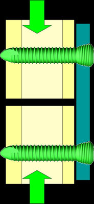 Abb. 1: Durch ein Gewinde wird die Schraube in der Platte fixiert (Kopfverriegelungschrauben). Es entsteht ein Implantat. Die axialen Wechselkräfte werden vom Implantat aufgenommen, eine knöcherne Abstützung ist nicht erforderlich. (schematische Abbildungen mit freundlicher Genehmigung der Firma Synthes)