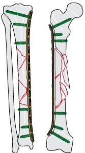2. Die „biologische Osteosynthese“ von metaphysären und diaphysären Frakturen. Die Frakturregion wird nicht eröffnet. Die Reposition erfolgt geschlossen zunächst durch Lagerung und Längszug (Ligamentotaxis). Die Platte wird über kleine Inzisionen am Knochen entlang eingeschoben. Für den distalen Femur und die proximale Tibia stehen vorgeformte Platten zur Verfügung (LISS), die mit einem Zielgerät so verbunden sind, dass die Plattenlöcher rasch aufgefunden werden können. Zur weiteren Feinreposition können Fragmente über Stichinzisionen mit Zugschrauben weiter adaptiert oder gegen die Platte gezogen werden. Durch frakturfern eingebrachte Kopfverriegelungsschrauben wird das Konstrukt aus Knochen und Platte winkelstabil fixiert und die Fraktur bis zur Ausheilung übungsstabil geschient. Typische Anwendungen sind gelenknahe Frakturen der proximalen und distalen Tibia und des distalen Oberschenkels, inklusive periprothetischer Frakturen. Bei intraartikulärer Fraktur  ist dabei auch eine zunächst offene Rekonstruktion der Gelenkfläche mit anschließender geschlossener Überbrückung der metaphysären Trümmerzone möglich.
